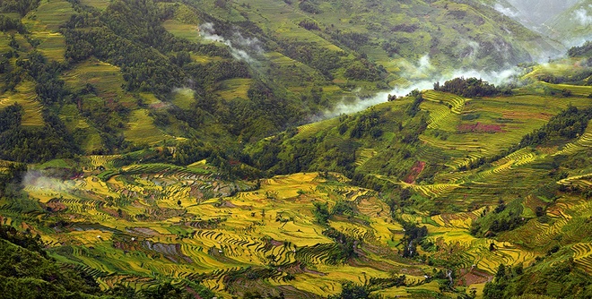 Ruộng bậc thang là phong cảnh ngoạn mục, nơi có các sườn núi dốc của Ai Lao Sơn cao chót vót và vực sâu hiểm trở bên dòng sông Hồng. Nước trên những thửa ruộng không bao giờ đóng băng vào mùa đông nhưng lượng nước chỉ đủ cho một mùa lúa trong năm. chấm dứt mùa gặt, từ giữa tháng 9 đến giữa tháng 11, những bậc ruộng luôn đầy ắp nước cho tới mùa cấy vào tháng 4 năm sau.